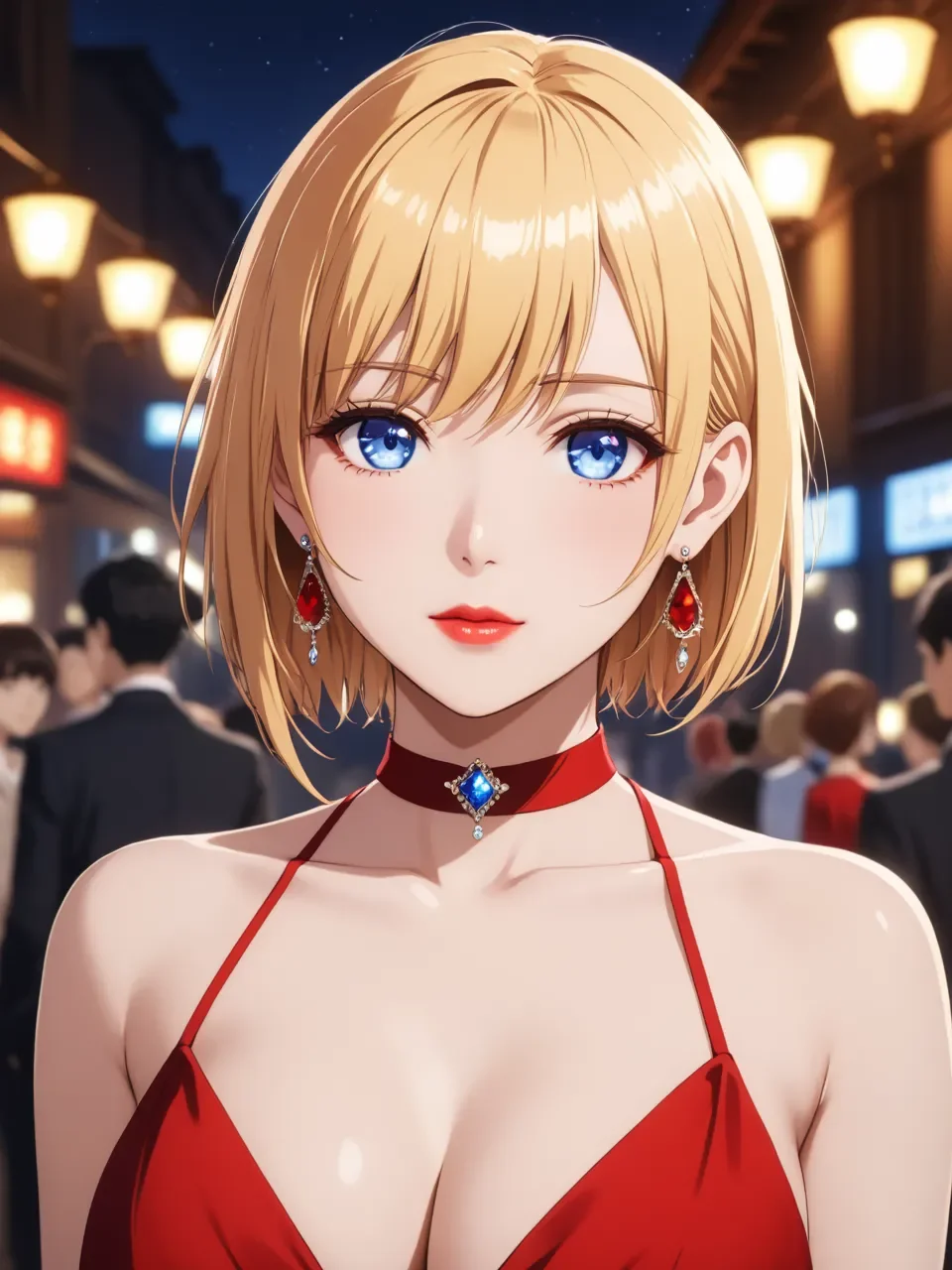Neon,breasts,earrings,jewelry,dress,red_dress,solo_focus,blonde_hair,blue_eyes,cleavage,short_hair,looking_at_viewer,choker,bangs,bare_shoulders,upper_body,multiple_girls,blurry_background,armlet,blurry,lips,collarbone,formal,medium_breasts,large_breasts,red_lips,closed_mouth,night,super realistic,Unreal 5 Engine,Floodlight